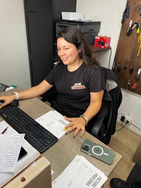 Karen Gammelgaard ordner regnskab, tager imod pakker med dele til biler, taler med kunder og leverandører i telefon og ordner meget andet.