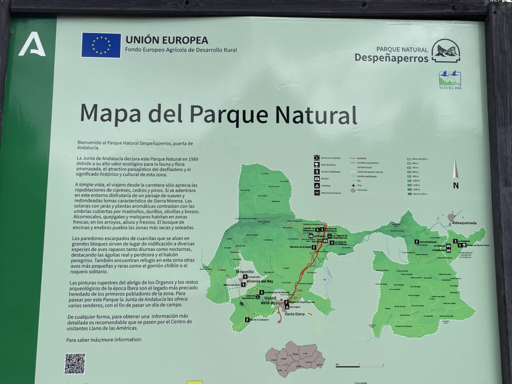 Nu gælder det naturparken, og nu er det let, for vi kører bare tilbage mod Santa Elena og lige efter at vi har krydset motorvejen på en bro, ser vi et stort skilt med Parque natural Despeñaperros. Vi følger blot skiltene og ser, at vejen ligger på den gamle vej nordpå fra Andalusien. Den slynger sig ret vildt, og over os kan vi beundre den nye motorvej, der svæver over landskabet og endelig har fået gjort det let at komme fra Andalusien og op på den castilianske højslette og omvendt. At dette ikke har været nogen nem opgave er indlysende, men nu er der skåret en hel time af turen, så det har været umagen værd, i hvert fald set med en bilists øjne.