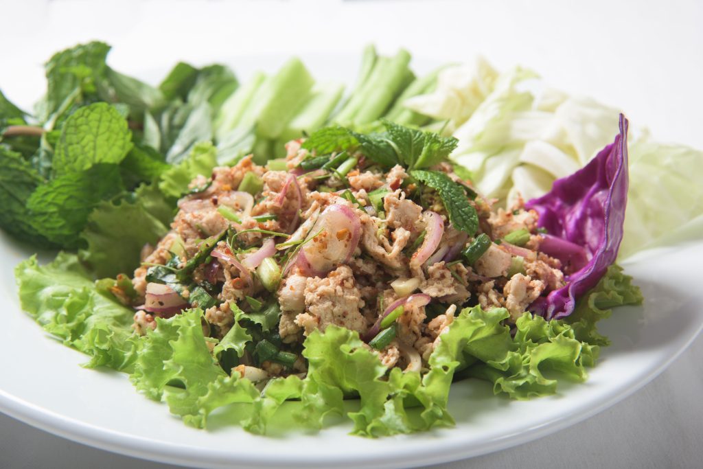 Laab Gai eller Laab Moo. Salat af finthakket kød, henholdsvis kylling (Gai) eller okse (Moo), iblandet finthakkede urter og tilberedt med fiske-sauce (Naam Pla). En typisk hovedret fra det nord-østlige Thailand, som normalt serveres varm på restauranter, men som også kan nydes afkølet. Traditionelt er retten stærk, men jeg synes også, den er meget god uden chili.