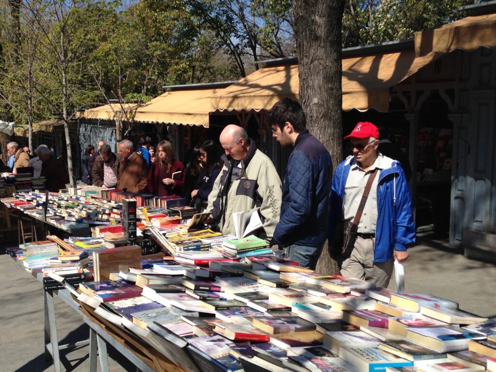 Calle Cuesta de Moyano (også kendt som Claudio de Moyano) som ligger ved siden af den smukke park, er bog-elskernes Eldorado. Gaden er fyldt med små boder, hvor der sælges nye og brugte bøger, og der står folk i alle aldre med bøjede hoveder og jager litterære skatte i den varme eftermiddagssol.