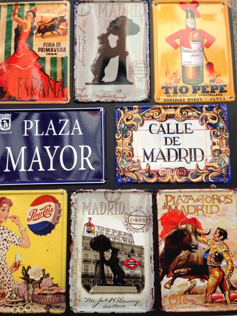 Der findes sågar bjørne i skovende på den iberiske halvø, og i gamle dage var der mange af dem i områderne omkring Madrid. Derfor har Madrid en bjørn i sit byvåben. Der er lavet en bronzestatue af den herlige bjørn som står på Plaza de la Puerta del Sol og køen med små børn som vil løftes op for at klappe bjørnen på poterne er lang. Dette er virkelig Spaniens absolutte centrum, og vi befinder os på km 0 i det radiale netværk af spanske veje.