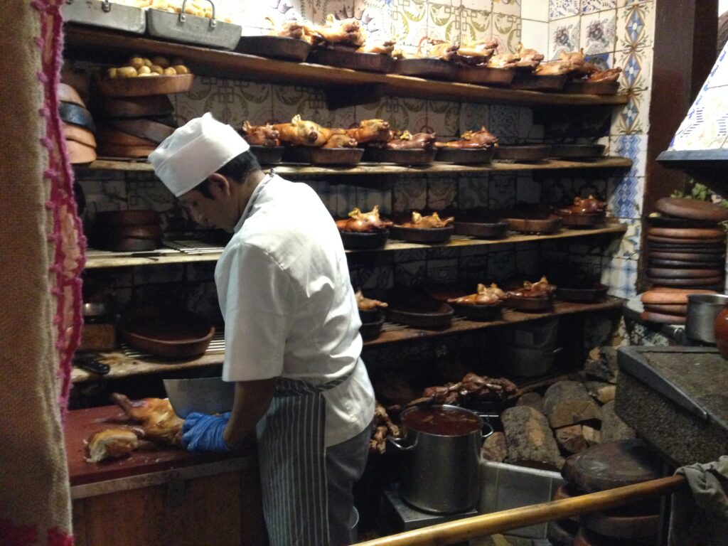 Dagen afsluttes med middag på El Botín, verdens ældste restaurant. Den fire etagers høje bygning står nærmest og læner sig til ydervæggen på Plaza Mayor. Dette var byens centrum i 1725, da restauranten blev grundlagt, og det var her, købmænd og håndværkere holdt til. Stejle trapper og lavt til loftet binder de fire etager sammen, og det må være en udfordring at gå op og ned med tønder og karafler til krævende gæster. Vi vælger husets menu, Gazpacho Andaluz, grillet pattegris og is. Menuen koster 45 euro inkl. brød, vin/øl og mineralvand. Det er godt investerede penge, og vi konkluderer, at Gazpacho Andaluz i karton fra Mercadona aldrig mere er det samme.