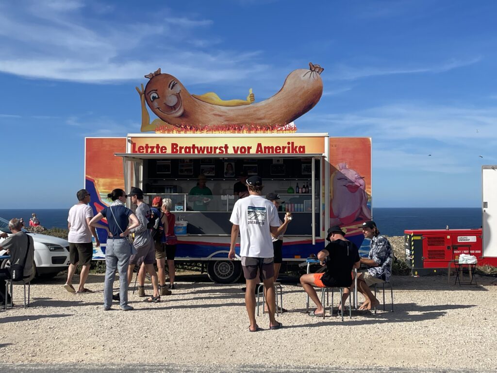 Så mangler vi bare lige at kigge på Cabo de San Vicente, som kun ligger 7 km. fra fortet. Her står der et betydeligt fyrtårn, men man kan ikke komme ind på området, så man må nøjes med at inspicere de mange boder, der er opstillet her, herunder en pølsebod, som på tysk reklamerer med, at man kan købe: ”Den sidste pølse inden Amerika”. Det så ud til at virke, for der var pænt med kunder.