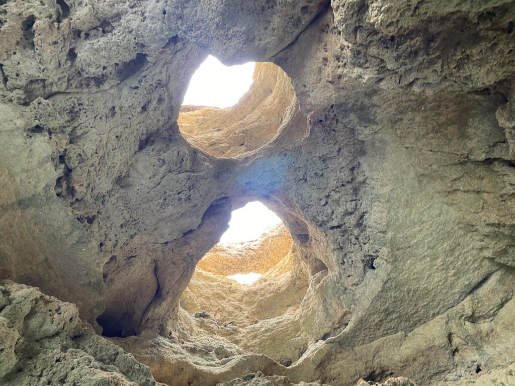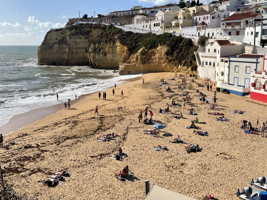 Jeg havde læst om den fortryllende hule Benagil med huller som i en Emmentalerost i kuplen, og den skulle jeg bare se. Heldigvis var byens turistkontor åbent, og jeg forhørte mig, om det var muligt at bese hulen på egen hånd. Det var det aldeles ikke, det var kun muligt på en guidet sejltur, og selv om man selv havde lejet en kajak, var det forbudt at sejle ind i den uden tilladelse. Så nu gik jagten ind for at komme med i sådan en båd, som kun sejler i magsvejr, da det ellers er alt for farligt. I dag var der ingen bådture, for havet var uroligt havde store bølger med hvide toppe.