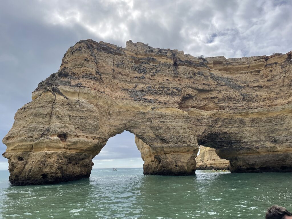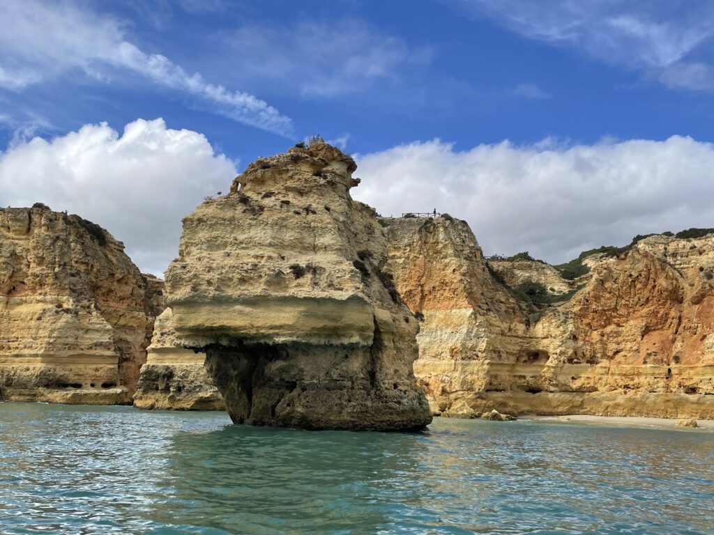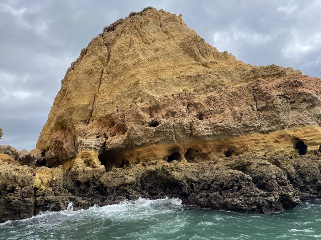 På den første klippe kunne man se en lille elefant i sten, men den slags ”dyrefund” er jo bare sjov og pjat omend lidt pudsigt. På turen, som varede lidt over en time, sejlede vi ind i omkring 20 huler, som alle havde navne så som: strandhulen (som havde en fin lille sandstrand), smuglerhulen (hvor smuglere fra Marokko landede cigaretter, som blev hejset op af deres medkumpaner gennem nogle huller i hulens kuppel), hulen med ansigtet (man kunne se profilen af et ansigt), krokodille hulen (en krokodillelignende form kunne ses), spøgelseshulen (hulen havde to huller i loftet og når man tog et billede af hullerne med sin telefon, opstod der en blå spøgelseslignende figur på skærmen), den mystiske mands hule (en mystisk mand dukkede af og til op i hulen, men det var umuligt at finde ud af, hvordan han kom dertil), Emmentaler hulen (som har to flotte huller i loftet) og det er turens clou, fordi den er så flot. Det er den, der hedder Cueva de Benagil. Her blev vi alle fotograferet af guiden med hullerne i kuplen som baggrund. Der var flere huler hvis navne jeg ikke husker, og til sidst kom vi hen til Praia de la Marina, som er en vildt flot strand og udråbt til Portugals smukkeste.