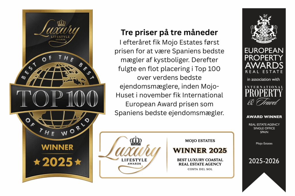 Mojo Estates, med base mellem Málaga og Marbella på Costa del Sol, har officielt fået titlen som Spaniens bedste ejendomsmægler. Den danskejede virksomhed, grundlagt af Mette og Per Mønsted samt Jacob Johansen, modtog prisen ved International Property Awards i London – en hæder, der cementerer Mojo`s position som en af de mest innovative og troværdige aktører på det sydspanske ejendomsmarked.