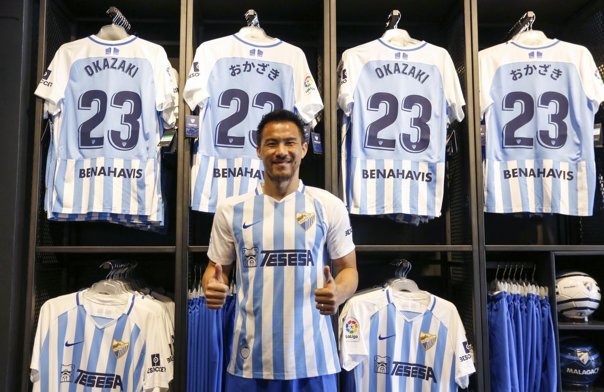 Bag Cristina på den ene væg i Málaga-shoppen at hav af nye Málaga CF t-shirts i nye kollektioner, som nu er til salg med rabatter på 30, 40 og 50 %. Det fik mig til at tænke på den væg for knap et år siden, da den japanske stjerneforward og berømte ex-landsholdsspiller Shinji Okazaki tegnede en 1-årig kontrakt med Málaga CF på en fri transfer fra engelske Leicester City.