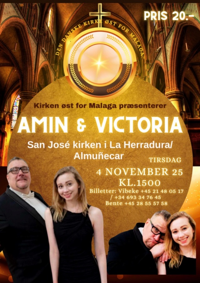 Tirsdag, den 4. November kl. 15 afholdes koncert med Amin Jensen og Victoria Asschenfeldt, i San José kirken i La Herradura. Prisen bliver 20 Euro, og billetter kan bestilles hos Vibeke: +45 21 48 05 17 / +34 693 34 76 45 eller Bente: +45 28 55 57 58