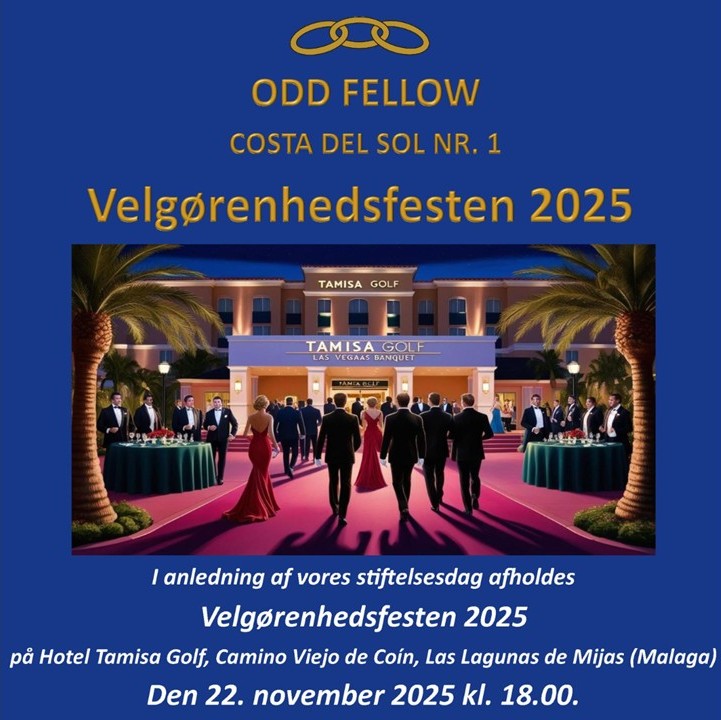 Velkommen til en vigtig velgørenhedsfest og en fantastisk aften. Hvis DU vil deltage i velgørenhedsfesten, måske donere præmier til lotteriet eller bidrage på anden måde, bedes du kontakte Undermästare Brian Jensen på e-mail: um@costa-del-sol.oddfellow.dk eller telefonisk +34 620178563.