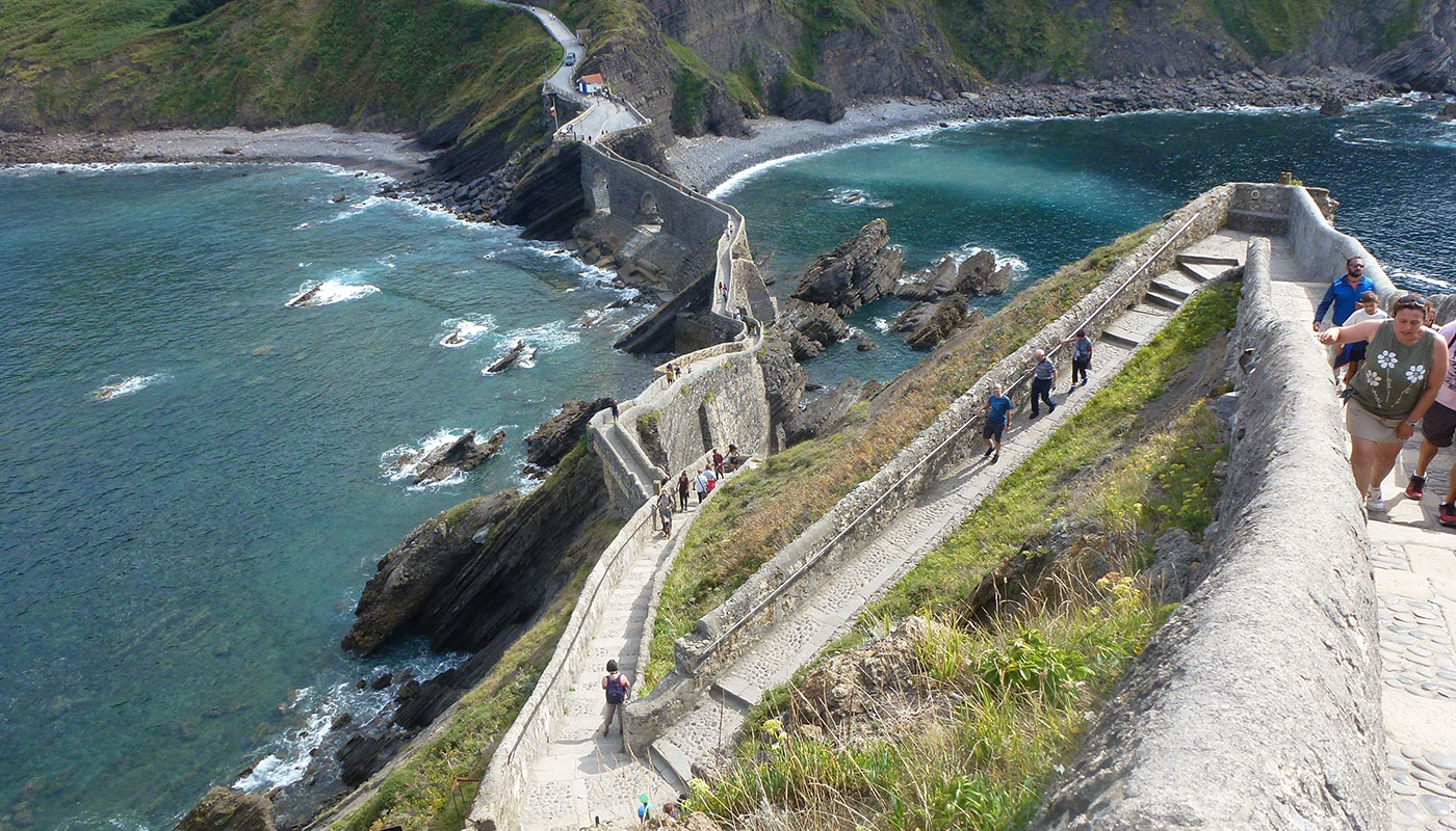 Nu skal vi besøge endnu et historisk monument, nemlig det uudtalelige Gaztelugatxe, som ligger på en lille ø mellem byerne Bormeo og Bakio, kun ca. 18 km. nord for Gernika. Gaztelugatxe betyder ´borg på en klippe´ og denne borg blev bygget allerede i 800 tallet. Klippen ligger kun få meter fra kysten, så det var en smal sag at bygge en lille bro derover og derefter bygge en trappe op til toppen. Klippen og borgen havde stor strategisk betydning op gennem Middelalderen, idet den beskyttede kysten og den vigtige havneby Bormeo.