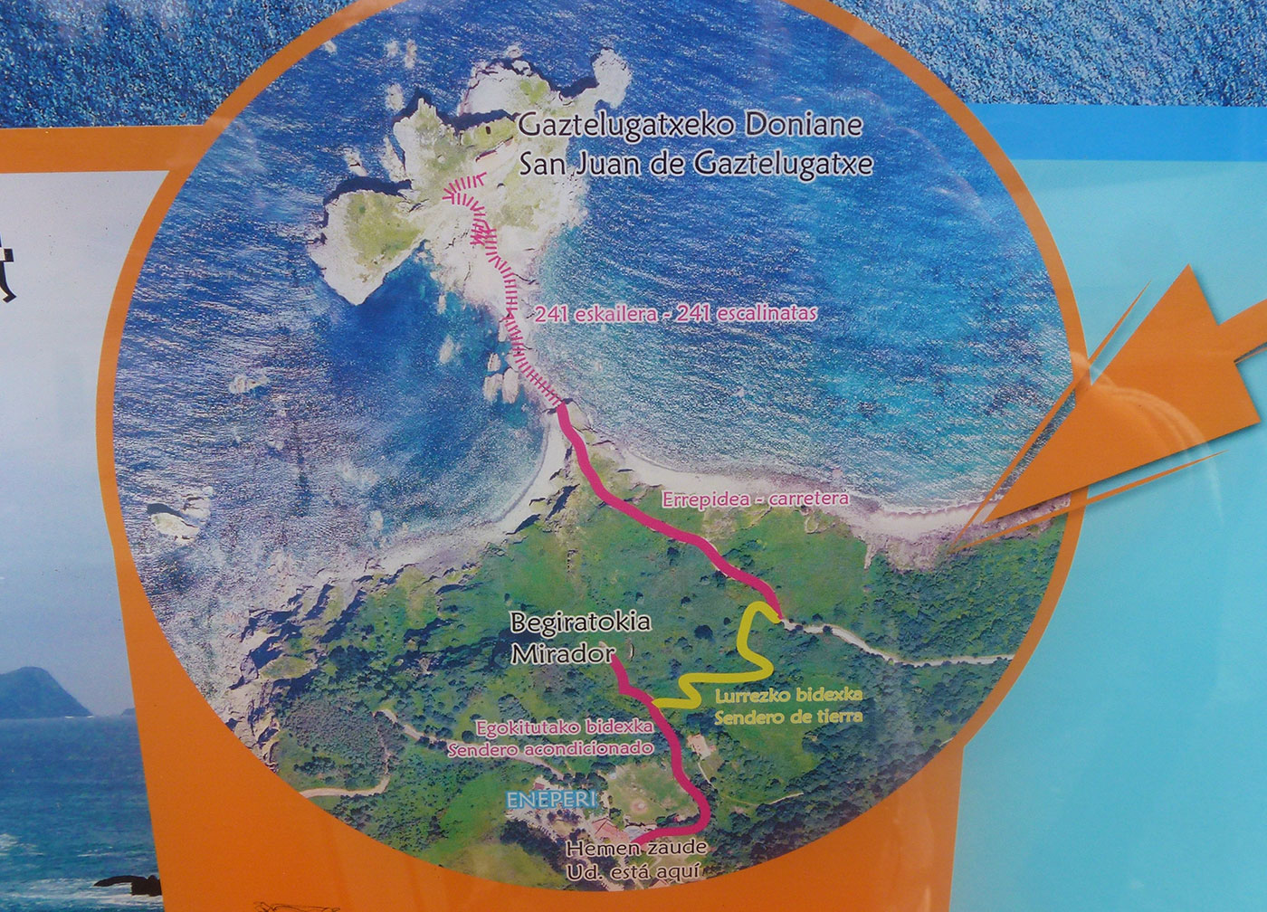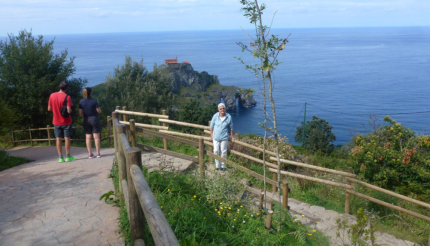 Oppe fra toppen har man en storslået udsigt over den vilde klippekyst og ud over Biscayen, som er et voldsomt og uroligt farvand, som man ikke skal spøge med. Ja, hvem husker ikke Kaptajn Skæg fra Rasmus Klump, som masser af gange havde ligget underdrejet i Biscayen? Det er nok ikke noget nutidens børn kender til, men vi pensionister gør jo. Mod vest kan man se den lille strandby Bakio, hvor er masse surfere holder til. Det er en meget speciel oplevelse at stå deroppe på klippen – ja, det må man bare prøve.