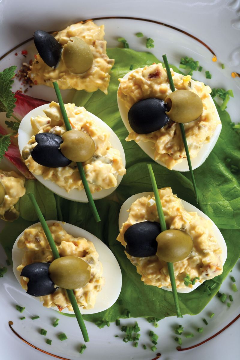 Blommen tages ud og blandes med finhakket ansjos, finhakket løg, hakkede kapers og sennep. Konsistensen justeres med lidt fløde. Så fordeles blandingen i hviden, som pyntes med en oliven og purløg.