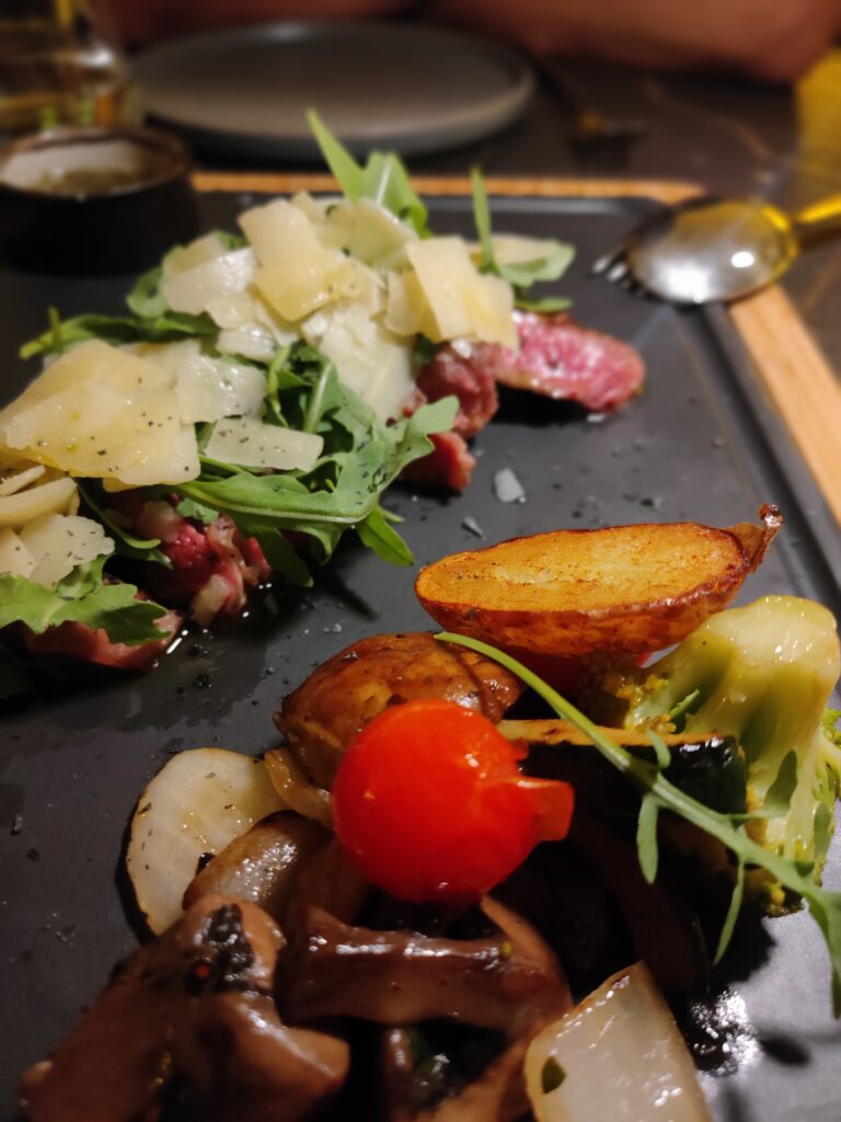 Hovedmåltidet blev en grillstegt entrecote, med parmesanost, og garniture samt chimichurri.