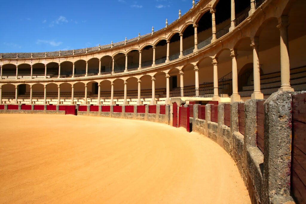 ”Det er et stort vægmaleri af håndmalede fliser med navne på alle de poeter, der har besøgt Ronda gennem årene. Af uforklarlige årsager står H.C. Andersen ikke på væggen,” beklager Lonnie Christiansen. På den anden side af gaden finder du vejen til hovedkirken i byen (Santa Maria la Mayor). Den er ikke stor – men har en lang historie. ”Kirken er bygget af resterne af den gamle moske fra mauretiden. Stærk atypisk er der bygget en balkon på katedralen. Det gjorde man for at beskytte de kongelige, når der var tyrefægtning. Dengang foregik det nemlig på åbne pladser,” forklarer vores guide. I den ”rigtige” tyrefægterarena står alle i sikkerhed, også selvom det er landets ældste arena. ”Den bruges kun én gang om året – den første weekend i september. Selve pladsen og museet står derimod åbent året rundt og skal ses – uanset hvad man synes om tyrefægtning,” mener Lonnie Christiansen.