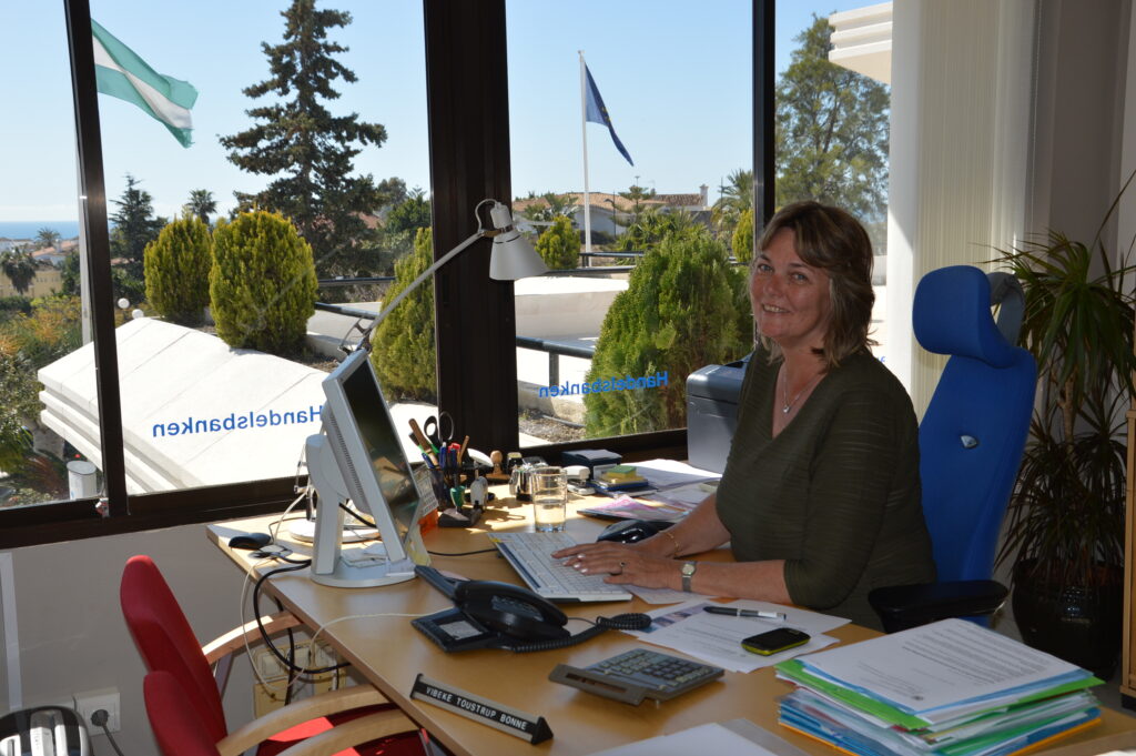 Vibeke Toustrup passede forrygende ind i en dansk bank i Spanien. Den stod primært på formuepleje i både Aktiv Banken, Sydbank, BG Bank, Danske Bank og Dexia. Men den stod også på fusioner. ”Jeg sad på samme kontorstol i fem forskellige banker. Både kunderne, produkterne, arbejdet og arbejdspladsen var stort set identisk, ”husker Vibeke med et grin. I 2005 fik hun dog en ny stol. Den står hos Handelsbanken i Nueva Andalucía. Arbejdsopgaverne er også nye. I dag er det primært boligfinansiering, hun arbejder med. Det er hun glad for. Præcis som hun er glad for livet – et liv hun selv har skabt. Vibeke Toustrup mistede nemlig på sørgeligste vis sine forældre allerede sidst i teenageårene. ”Jeg har ægte venner. Det er min familie,” bliver de sidste ord fra Vibeke. Hendes to hunde kan hun heller ikke undvære, og kæresten gennem de sidste otte år får også et par søde ord med på vejen.